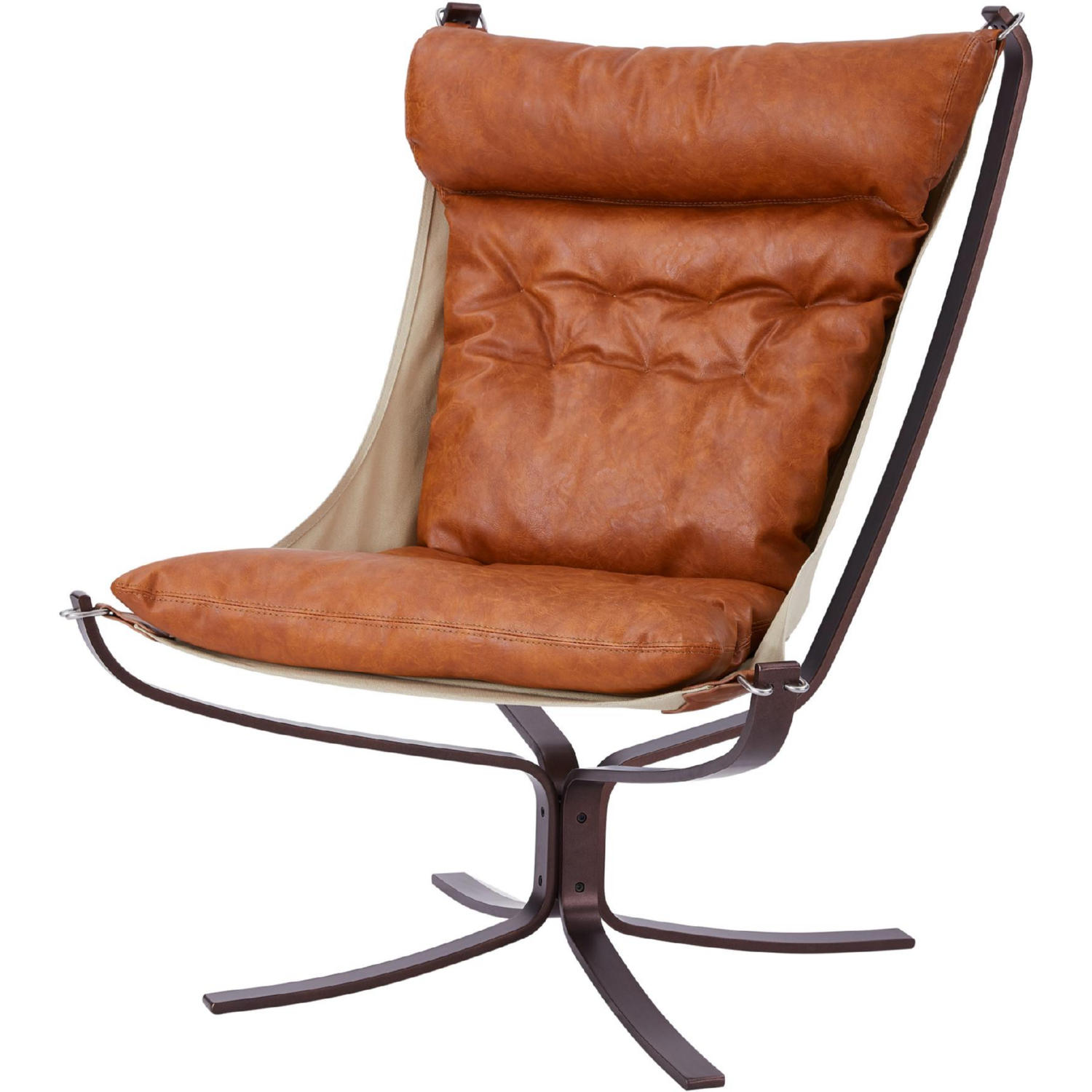 - Inspired by the 70's sling lounge chair, the Maxton highlights duo-tone tufted Caramel tone faux leather and canvas-like fabric on a X-base frame.