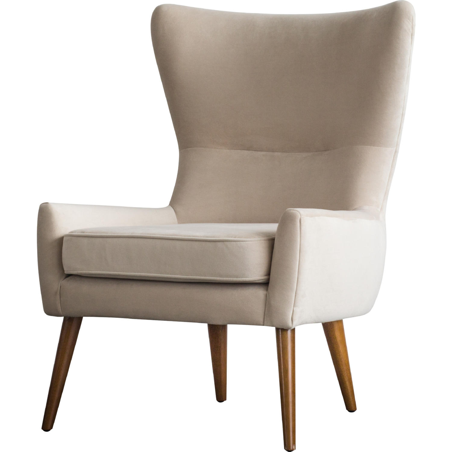 - MID MODERN ELEGANCE – Sophisticated Wing Back accent chair inspired by the Danish Modern look for your living space, features on-trend beige tone upholstery upheld on splayed Rubber wood legs.