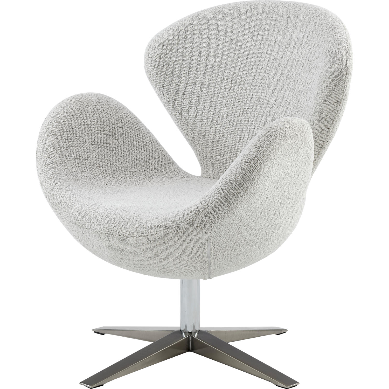 - Retro Modern replica accent chair; highlighted with soft, textured boucle fabric in chic beige tone and a 360-degree swiveling chrome steel legs for a vibe that fits well in a stylish living room and home office.