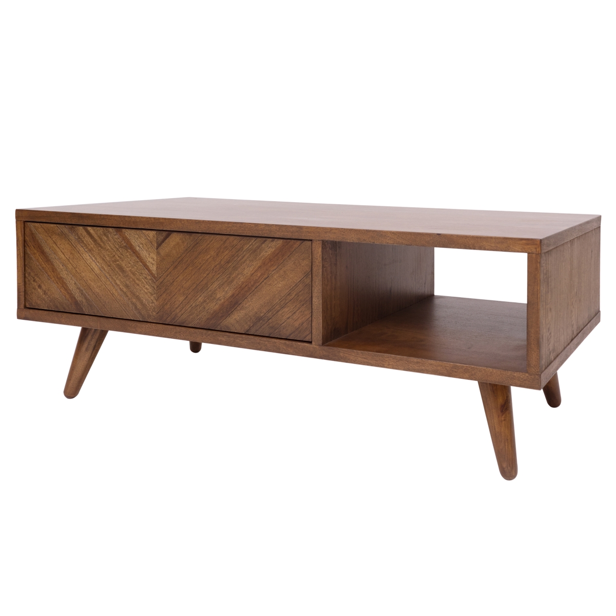 - Modern Mid Century- 18" h coffee table with 1-door panel and an extra open storage space is designed for a timeless appeal, featuring stylish chevron pattern front panels; constructed of solid Mango wood on splayed legs in gorgeous Brown tone.
