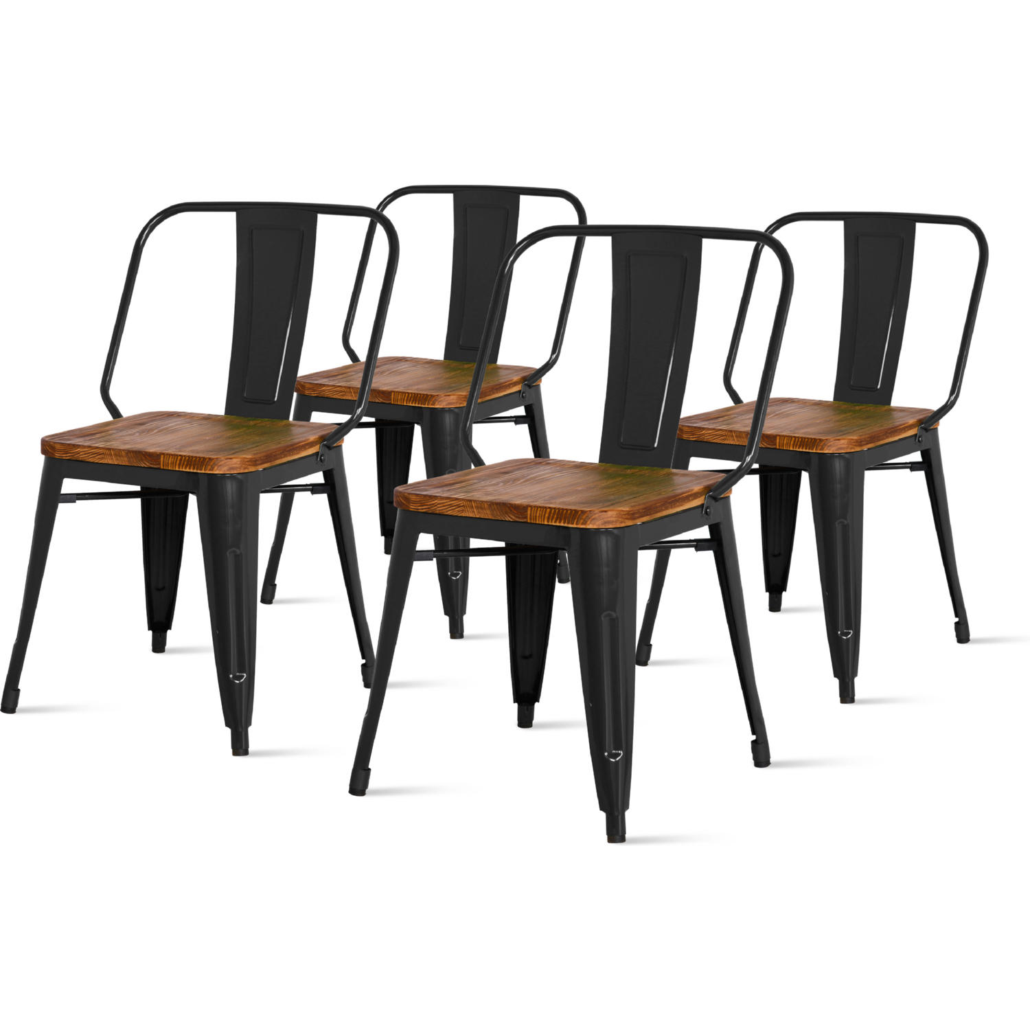- MOST POPULAR stackable bistro and café style metal chair. Featuring rustic wooden seat, X-brace seat support for stability and sturdiness, and rubber feet on all legs for scratch prevention. For indoor use.