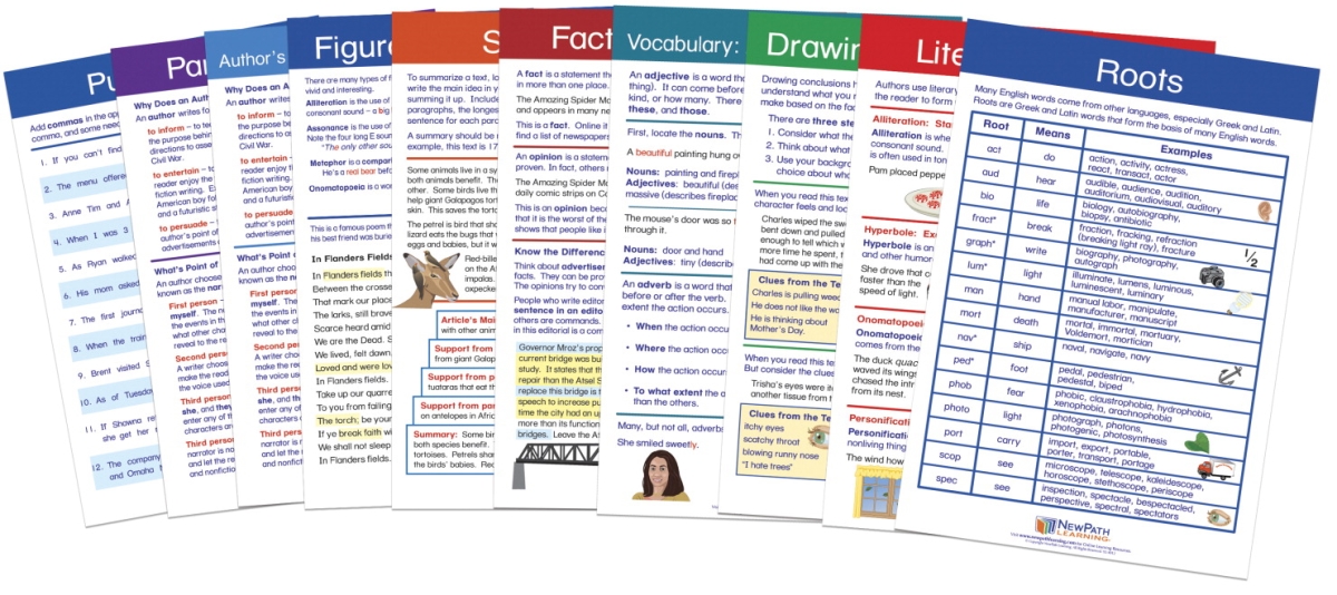 <p>Newpath ELA Visual Learning Guide collection consists of 10 laminated, Write-on/Wipe-off Guides. Each 11 x 17 in guide covers a different topic and includes 4 panels featuring an illustrated overview of the concept; labeling & review exercises; vocabulary activities; and assessment & review questions. Includes Teacher Guide with instructions for successful classroom integration. Comprehensive coverage of: Root Words; Prefixes & Suffixes; Spelling Patterns; Parts of a Book; Context Clues; Making Predictions; Analogies; Sequencing; Punctuation: Commas, Semicolons, Colons; and Spelling Common Homonyms & Plurals. Grade 6. </p>