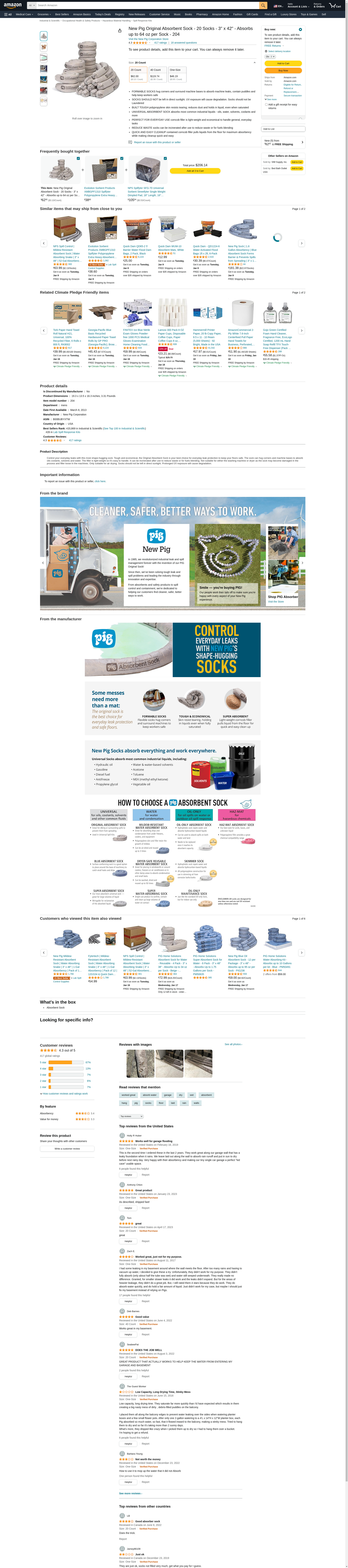 New Pig Original Absorbent Sock - 20 Socks - 3" x 42" - Absorbs up to 64 oz per Sock - 204