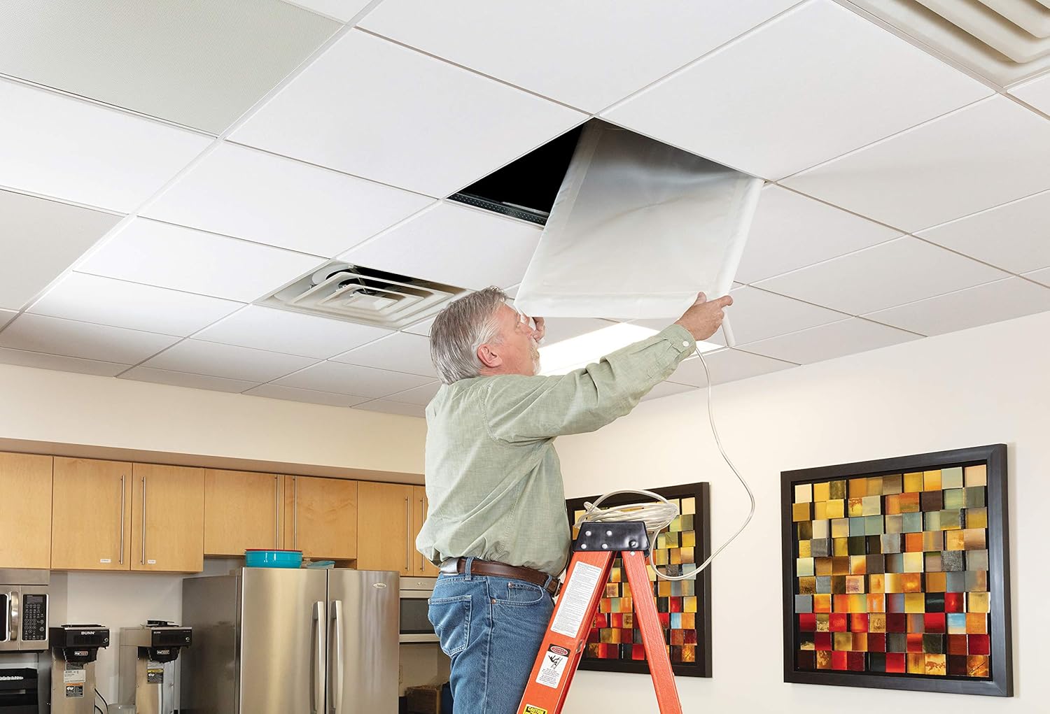 - Mounted on a lightweight, sturdy frame that sits on suspended 2' x 2' or 2' x 4' acoustical tile