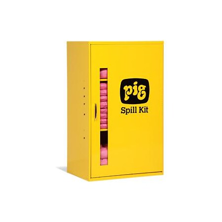 - Safety-yellow, heavy-gauge, welded steel cabinet is printed "Spill Kit" for quick identification