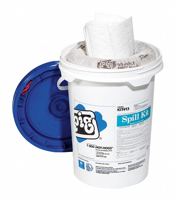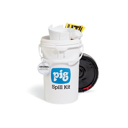 Just grab and go for fast response to oil spills up to 4.5 gallons. Plus, the container is UN Rated for shipping waste! Kit Container: Bucket Fluid Absorbed: Oil-Based Liquids - Not Water Color: White Absorbency: Up to 4.5 gal. High Visibility: No See-Through: No Sold as: 1 each Weight: 11 lbs. # per Pallet: 27 Composition: Bucket - 100% Polyethylene, Mat - Polypropylene, Socks - Skin - Polypropylene, Fillers - Hydrophobic Cellulose; Polypropylene Includes: 1 - ext. dia. 3" x 10' L PIG Skimmer Oil-Only Absorbent Sock (SKM203) 1 - ext. dia. 3" x 48" L PIG Oil-Only Absorbent Sock (SKM210) 4 - 15" W x 20" L PIG STAT-MAT Absorbent Pad (MAT214) 6 - 2" W x 6" L Tamperproof Seal Label (LBL100) 2 - 18" W x 30" H Polyethylene Disposal Bags (BAG201-S) 1 - Instructions UNSPSC: 47131905 UV Resistant: No Wheels: No Wheels