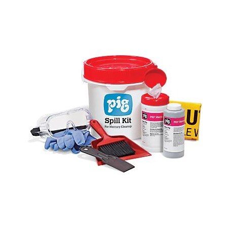 - KIT CONTAINS: 1 - PIG Mercury Absorbent Powder, 1 - Goggles, 1 - Gloves, 1 - 8.5" W x 9" L PIG Mercury Cleanup Wipers, 1 - Dust Pan & Hand Broom, 1 - 18" W x 30" H Polyethylene Disposal Bags, 1 - Spatula, 1 - Polyethylene Container and Lid