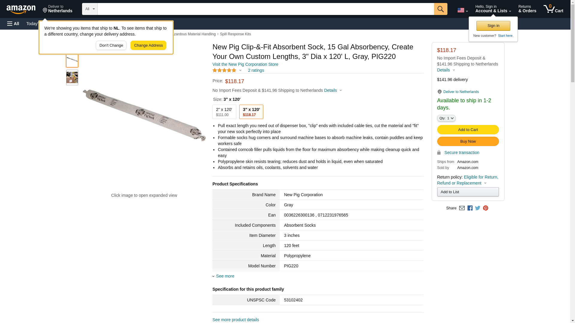 New Pig Clip-&-Fit Absorbent Sock, 15 Gal Absorbency, Create Your Own Custom Lengths, 3" Dia x 120' L, Gray, PIG220