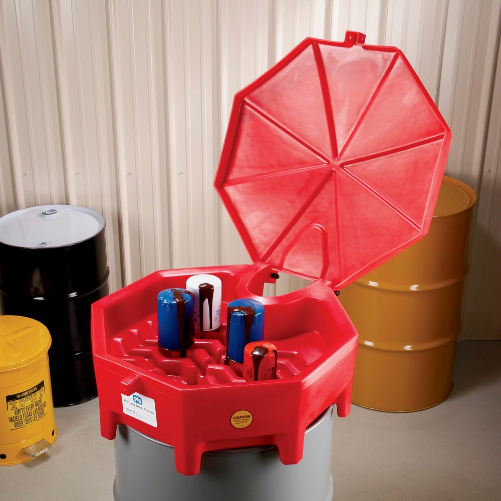 New Pig Drum Funnel | Universal Poly Drum Funnel with Hinged Lid | for 55 gal. Plastic or Steel Tight-Head Drums | Red | DRM672-RD