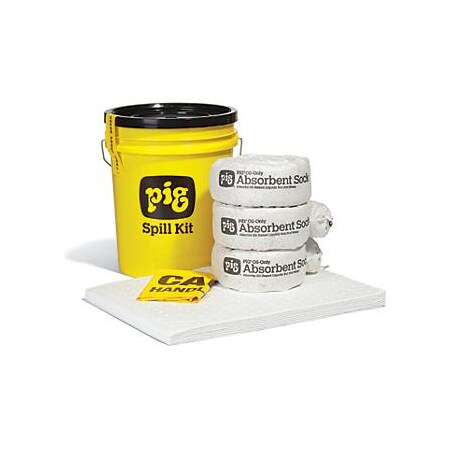 <p> This PIG Oil-Only Spill Kit in 5-Gal. High-Visibility Economy Container is ideal for everyday spills of fuels and oil-based liquids. Oil-Only absorbents soak up oil, fuels, and oil-based liquids, but not a drop of water. Basic container saves money when you don't need a UN Rated container for disposal of spent absorbents. Nonthreaded lid lifts off for fast, easy access. Lightweight 100% polyethylene containers resists chemicals and keeps contents clean and dry. Features molded-in handles for easy carrying. Temporary disposal bags with ties help make cleanup fast and easy. Tamperproof seal helps prevent pilfering of spill response supplies.</p><p><b>Specification: </b><ul><li>Item - Spill Control: Spill Kit/Station</li><li>Container Type: Bucket</li><li>Spill Control - Fluids Absorbed: Oil-Based Liquids</li><li>Volume Absorbed Per Pkg.: 4.3 gal.</li><li>Container Capacity: 5 gal.</li><li>Height: 14-1/2"</li><li>Width: 12"</li><li>Length: 12"</li><li>Wheels: No</li><li>Lockable: No</li><li>Static Dissipative: Yes</li><li>UV Resistant: No</li><li>Portable: Yes</li><li>Number of Components: 21</li><li>Color: Yellow</li><li>Includes: (8) 15" W x 20" L PIG(R) STAT-MAT(R) Absorbent Pad, (3) Ext. Dia. 3" W x 48" L PIG(R) Oil-Only Absorbent Sock, (2) 18" W x 30" H Polyethylene Disposal Bags, (6) 2" W x 6" L Tamperproof Seal Label, Instructions</li><li>Item: Spill Kit</li></ul></p>