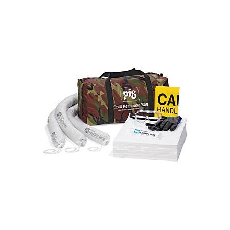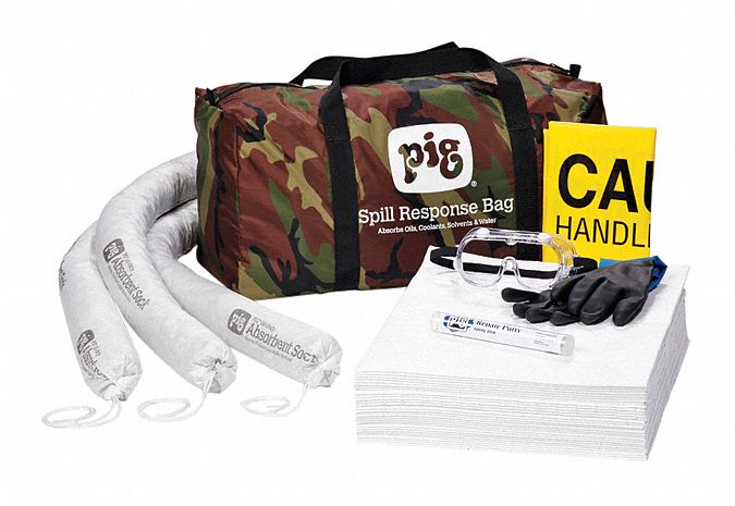 Versatile portable oil spill kit in a durable camo hunting bag. Kit Container: Portable Bag Fluid Absorbed: Oil-Based Liquids - Not Water Color: Camo Absorbency: Up to 9.5 gal. High Visibility: No See-Through: No Sold as: 1 each Weight: 11.5 lbs. # per Pallet: 24 Composition: Mat - Polypropylene Socks - Skin - Polypropylene Fillers - Hydrophobic Cellulose; Polypropylene Includes: 3 - ext. dia. 3" x 48" L PIG Oil-Only Absorbent Sock (SKM210) 30 - 15" W x 20" L PIG STAT-MAT Absorbent Pad (MAT214) 1 - 7" L PIG Multi-Purpose Epoxy Putty (PTY201) 1 - Economy Goggles (GLS290-AF) 1 - 13" L SHOWA Chem Master Neoprene Gloves (GLV213-XL) 5 - 18" W x 30" H Polyethylene Disposal Bags (BAG201-S) 1 - Instructions Shelf Life: 730 days UNSPSC: 47131905 UV Resistant: No Wheels: No Wheels
