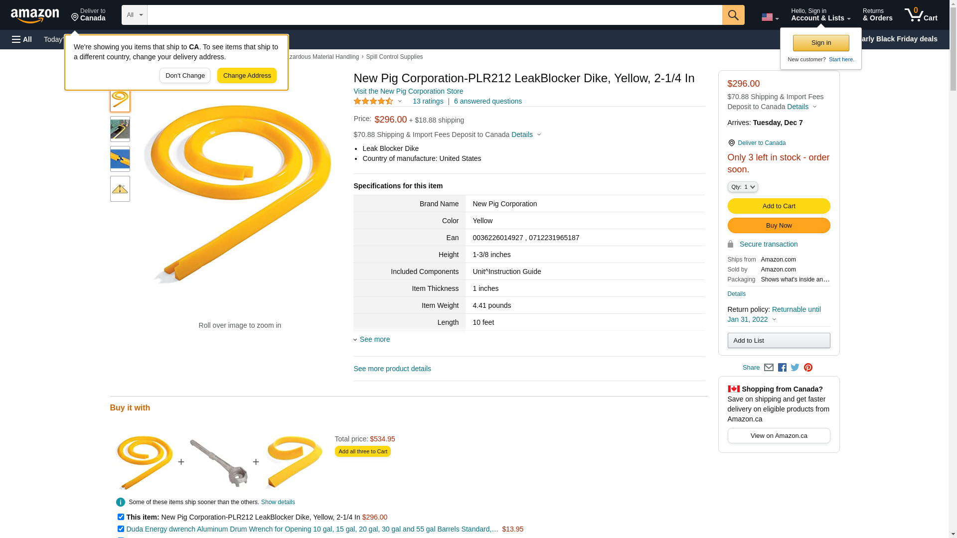 Leak Blocker Dike, Yellow, Material Polyurethane, Length 10 ft. , Width 2-1/4 In. , Height 1-3/8 In. , Application Spill Containment