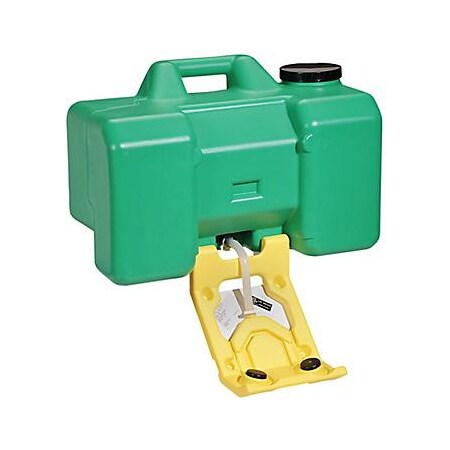 Proven, high-capacity design provides a rugged emergency eye wash station anywhere you need it. Simple, rugged polyethylene construction is well suited to long-term use in harsh environments Built-in carrying handle for easy transport is great for use on remote sites or from a truck bed Fold-down arm activates eye wash in one motion and protects spray outlets when not in use Steady flow rate of 0.4 gpm for 15 minutes meets requirements of ANSI Z358.1 Wide-fill opening with threaded cap allows easy filling, cleaning and inspection Wall bracket included for optional mounting Sterile Eye Wash Water Preservative (GEN950) is a required accessory for this unit Capacity: 9 gal. Style: Portable Color: Green/Yellow Dimensions: 10" W x 22" L x 12" H Dispensing Method: Gravity-fed Fluid Storage Method: Tank Sold as: 1 each Weight: 9.518 lbs. # per Pallet: 18 Composition: HDPE Flow Rate: .4 gal/Minute Minimum Includes: 1 - J-Hook Style Mounting Bracket UNSPSC: 46181810