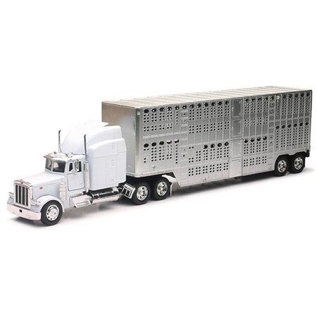 New-Ray NEW12073B-WT Peterbilt 379 Truck in White with Pot Belly Livestock Trailer in Chrome Cab