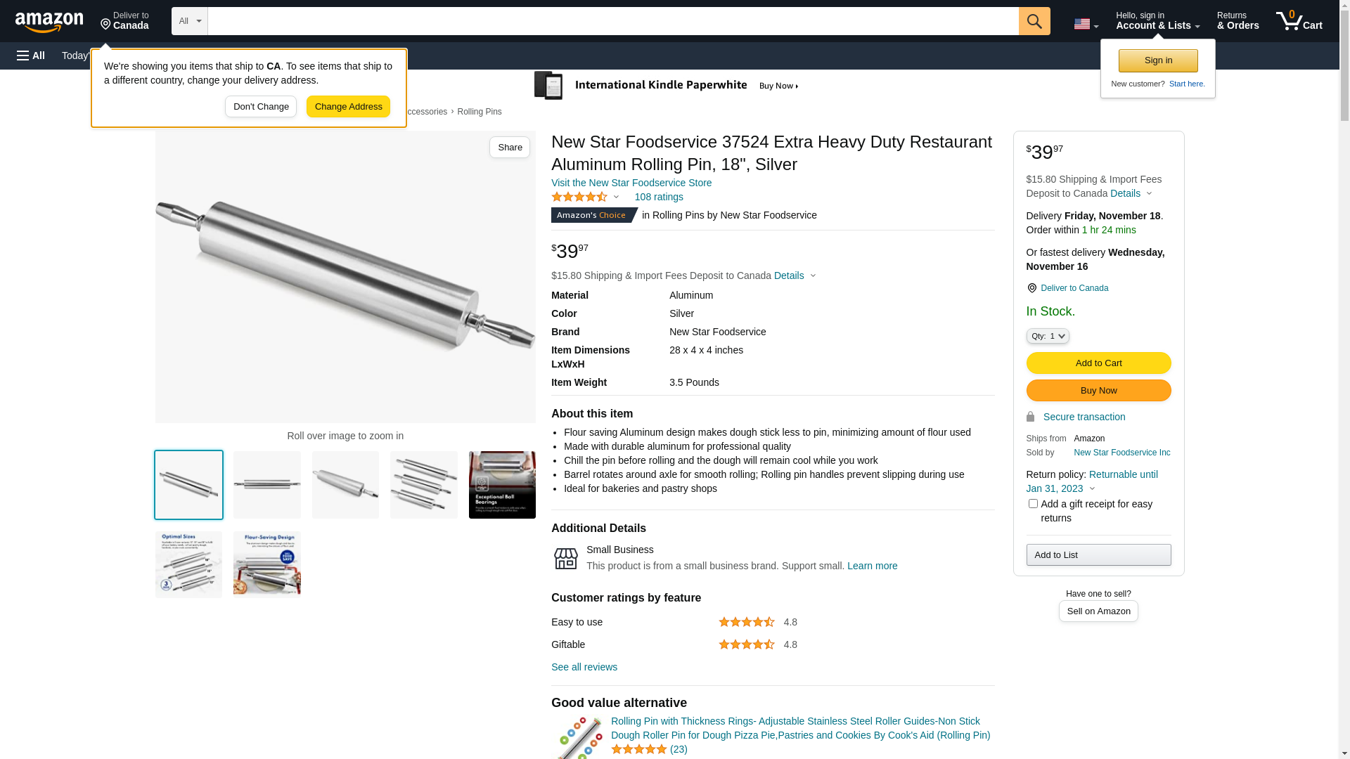 New Star Foodservice 37524 Extra Heavy Duty Restaurant Aluminum Rolling Pin, 18", Silver