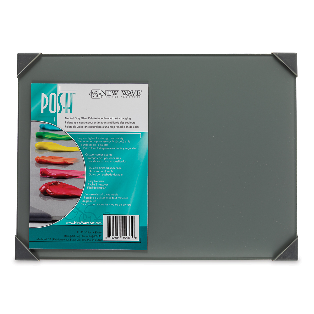 New Wave POSH glass artist palettes are everything the name implies. Available in grey, white, and clear, as well as multiple sizes, 9"x12, 12"x16, and 16"x20". The product uses 1/8" tempered glass for maximum strength and safety. Includes customer corner guards for added protection and surface traction. The edges are softened, and the underside (grey and white) is finished with a dense, solvent and water resistant formulation that has excellent color fastness. Easy to clean! Dried acrylic paint peels away, and dried oil paint can be removed with artist solvents or a single edge razor blade in a retractable scraper. Always use a fresh razor blade when cleaning. Steel tools have burrs that can cause scratches on any glass product. Use a plastic razor, plastic tools and solvent to avoid scratching. Use knife, scraper, or sharp objects with caution. The 9"x12" and 12"x16" products are designed to fit inside the Masterson Art Products Artist Palette Seal (blue lid) and the Sta-Wet (yellow lid and red lid) for storage and transportation. For use with all paint media as an artist palette, mulling surface, craft surface, and print ink/mono printing surface. Made in Pennsylvania, USA.