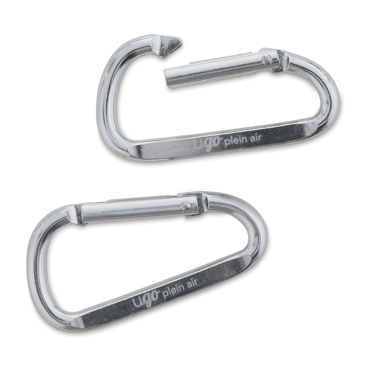 The u.go Plein Air line features a variety of items to suit every painter’s needs, with style and function in mind. The u.go carabiner set contains two stamped metal carabiners. When painting outdoors, the uses are endless.The carabiners are perfect for attaching tools and more to your art easel. When combined with the u.go Cinch (not included), the set becomes a unique hook for your turpentine canister, a paint towel, rubbish bag and more. Additionally, the set can be used to strap items to your day pack. Three different set combinations are available. The carabiners are a useful addition to plein air painting supplies.