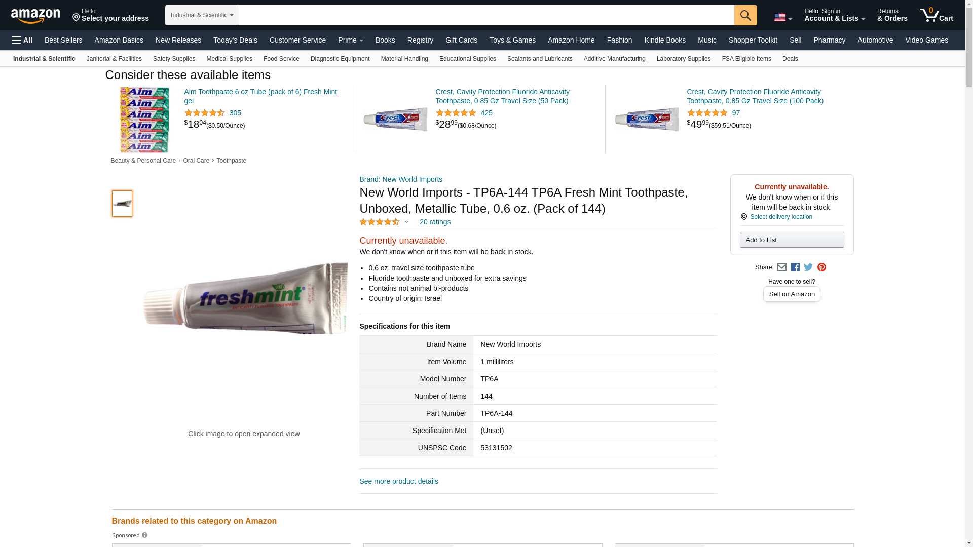 New World Imports - TP6A-144 TP6A Fresh Mint Toothpaste, Unboxed, Metallic Tube, 0.6 oz. (Pack of 144)