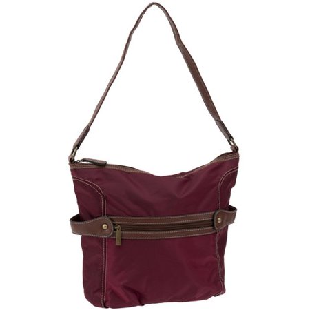 <br /> <b>Faded Glory Rugged Burgundy Hobo Handbag:</b> <ul> <li>Dimensions: 9.75"L x 4"W x 10.5"H</li> <li>Imported</li> <li>Material: shell is 100 percent polyester, trim is 100 percent PVC</li> </ul><p>Country of Origin: Imported