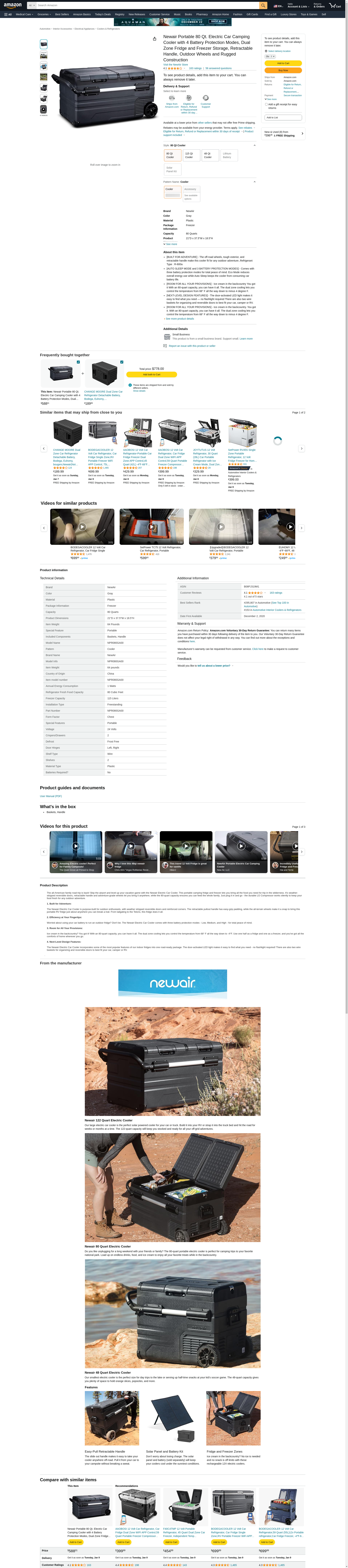 Newair Portable 80 Qt. Electric Car Camping Cooler with 4 Battery Protection Modes, Dual Zone Fridge and Freezer Storage, Retractable Handle, Outdoor Wheels and Rugged Construction