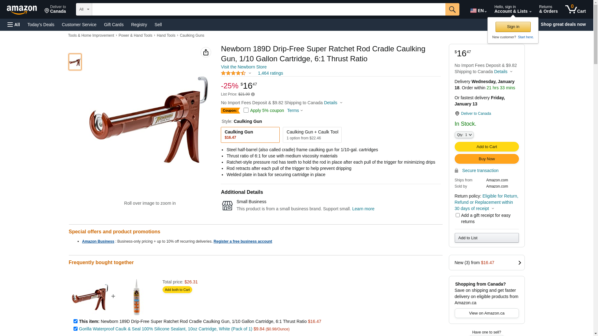 Newborn 189D Drip-Free Super Ratchet Rod Cradle Caulking Gun, 1/10 Gallon Cartridge, 6:1 Thrust Ratio