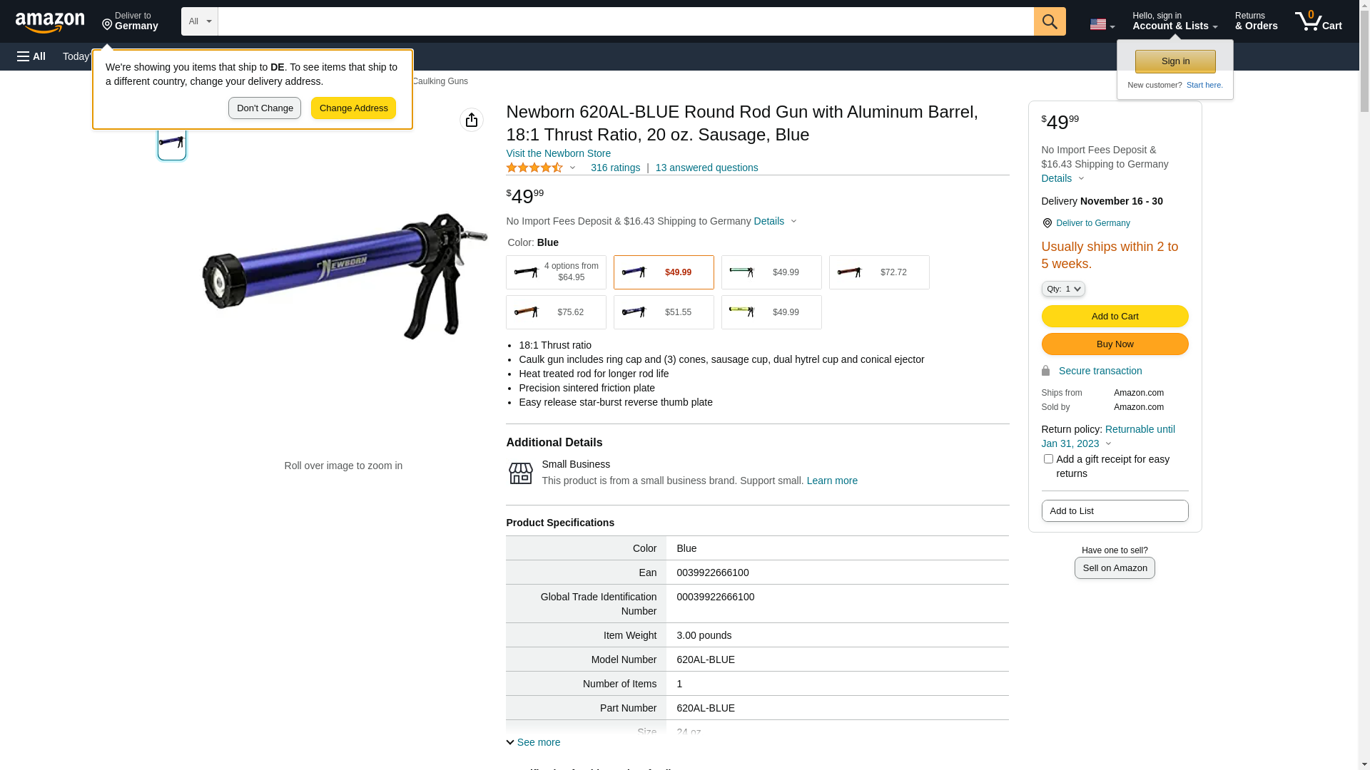 Newborn 620AL-BLUE Round Rod Gun with Aluminum Barrel, 18:1 Thrust Ratio, 20 oz. Sausage, Blue