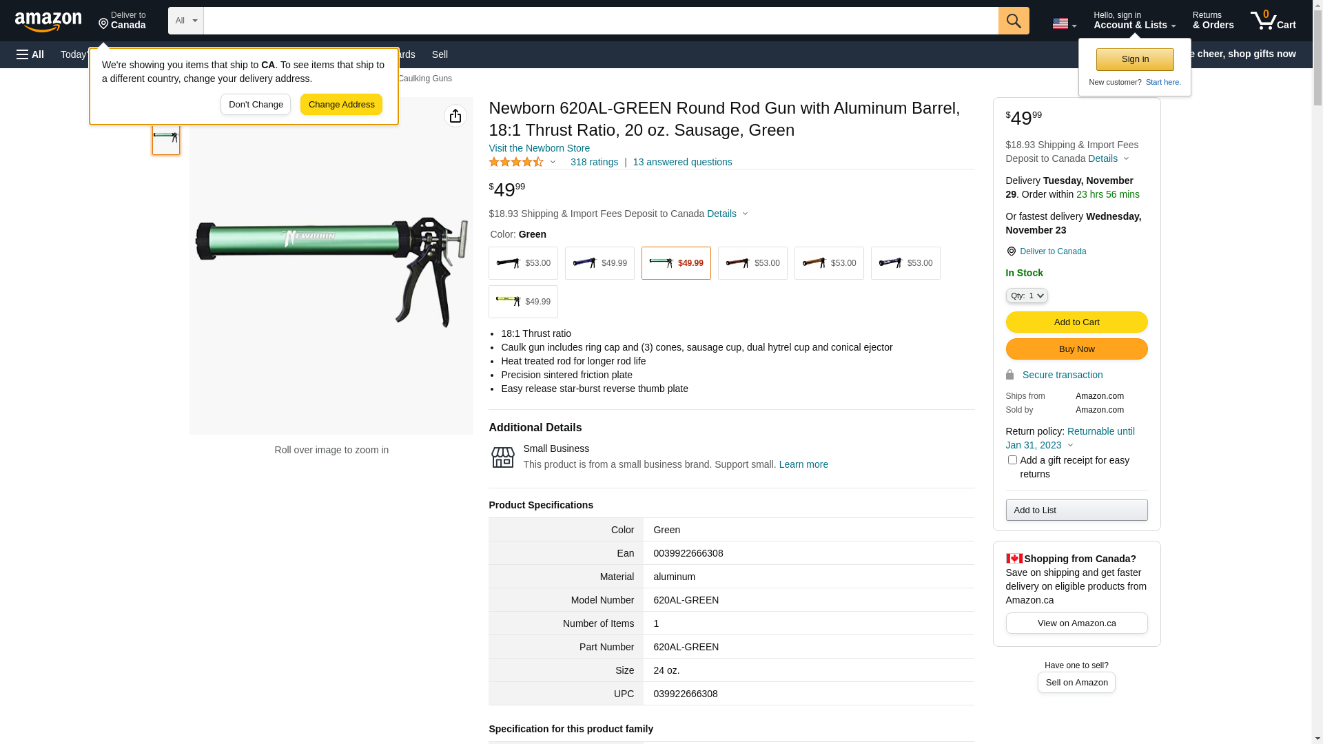 Newborn 620AL-GREEN Round Rod Gun with Aluminum Barrel, 18:1 Thrust Ratio, 20 oz. Sausage, Green