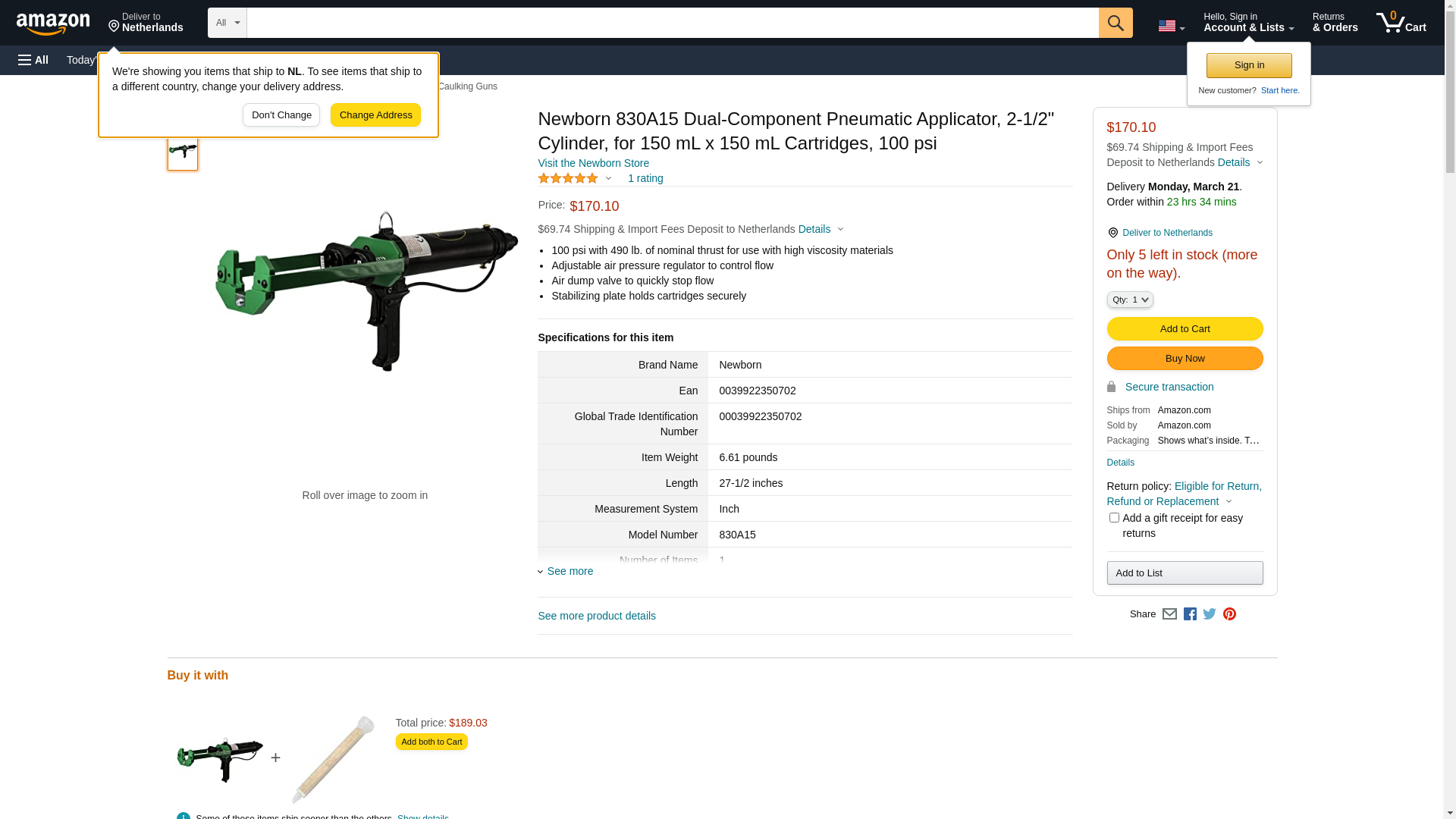 Newborn 830A15 Dual-Component Pneumatic Applicator, 2-1/2" Cylinder, for 150 mL x 150 mL Cartridges, 100 psi