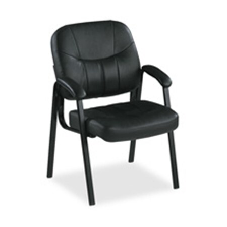 Executive guest chair offers a sophisticated look for any lobby, reception area or conference room. Design features fully upholstered seating with black, split leather for a rich classic look. Guest chair features stylish open loop arms and a black steel frame. Meets the CA117 fire retardant standard.