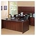Office furniture offers a high-quality, Mahogany laminate construction with metal-to-metal cam-lock connections. Design includes 3mm PVC edges and adjustable floor guides for stabilization. Furniture has predrilled holes with metal inserts for easy attachment. Brackets are designed for L-shape configurations and bridge returns.