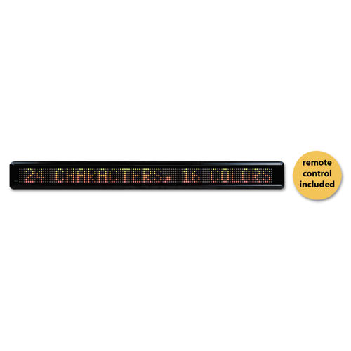 Material(s):Plastic<BR />Global Product Type:Signs & Sign Holders-Electronic Programmable<BR />Size:39 1/2 x 1 7/8 x 4 1/2<BR />Frame Color:Black<BR />Shape:Rectangular<BR />Depth:1 7/8"<BR />Width:39 1/2"<BR />Height:4 1/2"<BR />Display:24-Character Scrolling LED,7 x 120 Pixels<BR />Write-On/Wipe Off Surface:No<BR />Graphics Color(s):16-Color<BR />Quantity:1 each<BR />Pre-Consumer Recycled Content Percent:0%<BR />Post-Consumer Recycled Content Percent:0%<BR />Total Recycled Content Percent:0%<BR />Special Features:24 Character Display