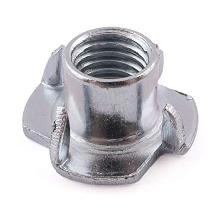 Internally threaded barrel-shaped fasteners integrally formed with a flat base, which has prong-type projections extending perpendicular from the base aside the barrel. T Nuts or also spelled Tee Nuts, have flanges on a thin surface of the nut which are offered in three or four “prongs.” These flanges act as hooks and are pulled into the material when the bolt is threaded into the nut. Tee nuts do require a pre-drilled hole. T nuts are designed to be used with a softer material such as wood or composites. Tee nuts are great for creating a flush finish on the nut side of wood.