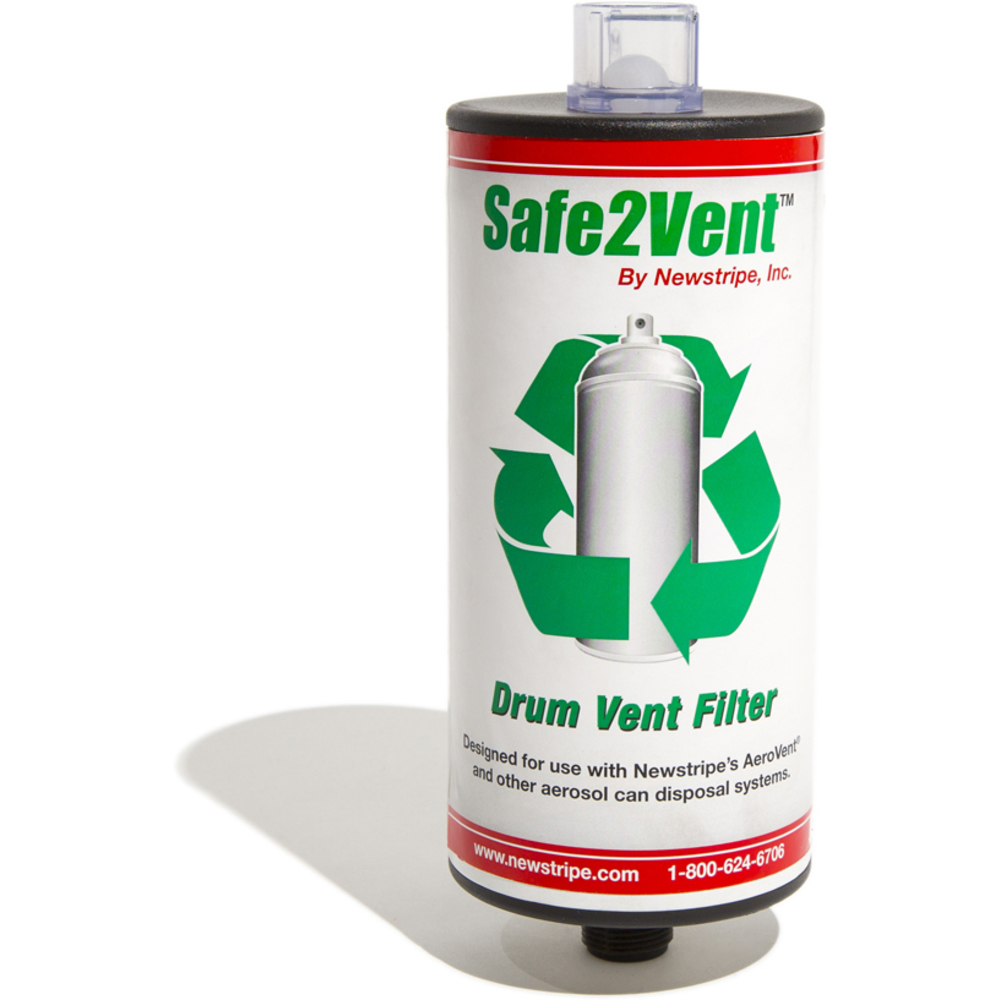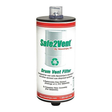 Newstripe 10004701 Safe2Vent Complete Filter Assembly. Safe2Vent coalescing carbon filter with the exclusive Viz-a-Ball indicator fits any 3/4" bung fitting and is designed for use with any single aerosol can manual puncturing unit. The indicator tells you when the process is complete and it is safe to open the puncturing machine. The check ball 'closes' the drum when not processing for compliance with EPA and California regulations while allowing venting of any dangerous pressures to conform to OSHA guidelines. Designed for use with 30 gal or 55 gal drums., Lot of 1