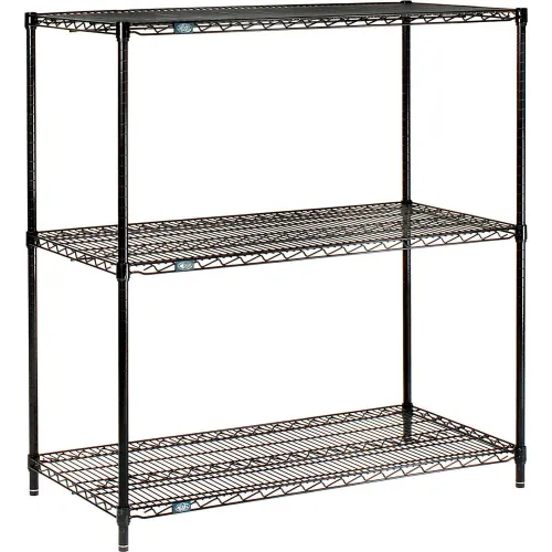 Black Epoxy Starter Units feature an attractive, rugged and affordable finish ideal for offices, retail stores, warehouses and more. This epoxy wire shelving is NSF approved for wet or dry use. Starter Unit includes 4 posts with leveling feet, 3 wire shelves and plastic snap on sleeves to secure shelves to posts., Lot of 1