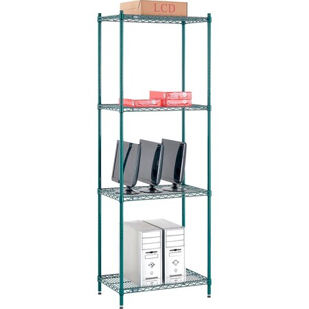Poly-Green® Wire Shelving Starter Unit is designed with a powder coated green epoxy finish that handles temperature and moisture extremes well. Starter Unit includes 4 posts with leveling feet, 4 wire shelves and plastic snap on sleeves to secure shelves to posts., Lot of 1