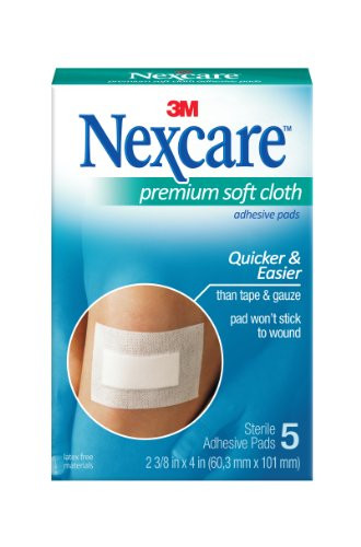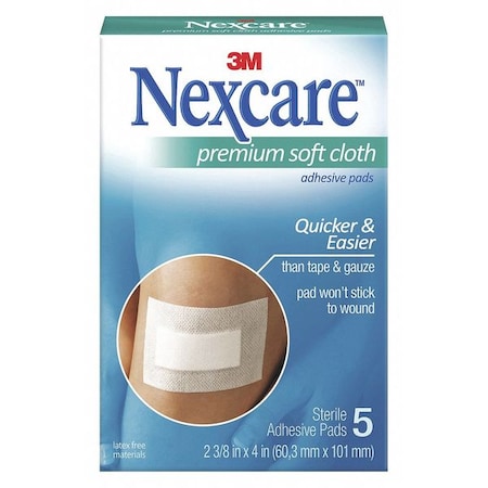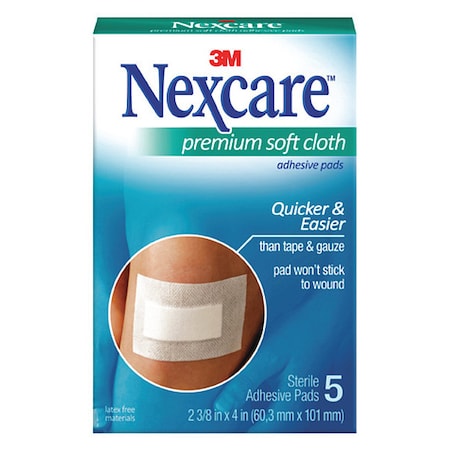 Nexcare(TM) Premium Soft Cloth Adhesive Pad, H3564, 2 3/8 in x 4 in, 5 ct. provide protection for your loved one's injury with a soft, non stick pad and strong holding dressing. Ideal for injuries like scrapes, minor burns and cuts, this medicine cabinet essential conforms effortlessly to the wound, and is highly breathable. This dressing can be worn up to 7 days and it has a water resistant formula so you don't have to reapply after every shower. Life's little mishaps can make us stronger¬–so get on the road to healing with the help of Nexcare All-In-One Adhesive Pads. Features: Provides protection to minor burns, scrapes, cuts and abrasions. Absorbent pad doesn't stick to your wound. Strong adhesive stays put for up to 7 days. Low-profile design conforms comfortably to your skin. Breathable design provides lasting comfort. Great for use on post-surgical incisions.