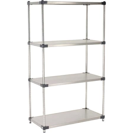 5 Tier Solid Stainless Steel Shelving Starter Unit, 36"W x 18"D x 63"H. Solid Stainless Steel Starter Units allow for display and storage of small equipment and instruments. Steel shelves feature a dual layer construction that provides strength and rigidity and is temperature and moisture resistant. Starter Unit includes 4 posts with leveling feet, 5 solid stainless steel shelves and plastic snap on sleeves to secure shelves to posts. 304 Stainless Steel. Raised lip surrounding the edge of each shelf to prevent spills from overflowing. Open styling to allow shelves to be reached from all sides. Includes 4 posts, 5 shelves and snap on sleeves. Shelves easily adjust without tools at 1" increments. NSF approved for wet or dry use. , Lot of 1