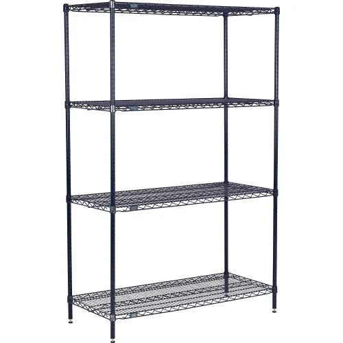 Starter Unit includes 4 posts with leveling feet, 4 wire shelves and plastic snap on sleeves to secure shelves to posts. Features a top of the line blue metallic finish designed to handle extreme wet, hot or cold environments., Lot of 1