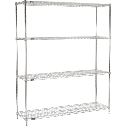 From Nexel Nexshelf Restaurant Shelving - Starter Shelving Unit, wire, 4 shelves, 4 posts and plastic shelf clips, 86"H, 18"W, 72"L, chrome-plated finish, shipped unassembled - Your Source for Quality Restaurant Equipment and Supplies.