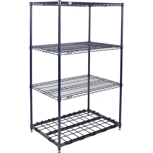 Nexelon® Starter Units with Dunnage Bottom Shelf feature a top of the line blue metallic finish designed to handle extreme wet, hot or cold environments. Starter Unit includes 4 posts with leveling feet, 3 wire shelves, 1 bottom dunnage shelf and plastic snap on sleeves to secure shelves to posts. , Lot of 1