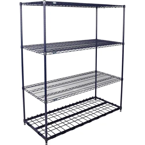Nexelon® Starter Units with Dunnage Bottom Shelf feature a top of the line blue metallic finish designed to handle extreme wet, hot or cold environments. Starter Unit includes 4 posts with leveling feet, 3 wire shelves, 1 bottom dunnage shelf and plastic snap on sleeves to secure shelves to posts. , Lot of 1