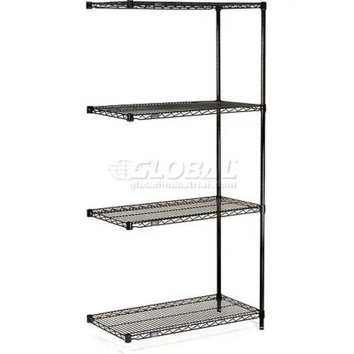 Add-On shelving units allow unit expansion to make the most of storage space. Includes 2 posts with leveling feet, 4 shelves, snap-on sleeves and S-hooks to join units. Black Epoxy is an attractive, rugged and affordable finish. This epoxy wire shelving is NSF approved for wet or dry use. , Lot of 1