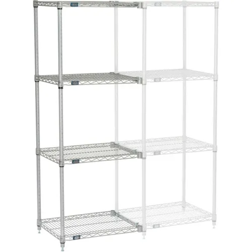 5 Tier Silver Epoxy Wire Shelving Add-On Unit, 24"W x 18"D x 63"H. Add-On shelving units allow unit expansion to make the most of storage space. Includes 2 posts with leveling feet, 5 shelves, snap-on sleeves and S-hooks to join units. Nexelate™ is an attractive finish that consists of a Silver Epoxy powder-coat over a rust inhibiting undercoat. NSF approved for wet or dry use. Reinforced shelves with welded surface ribs for added strength. Open design to maximize air and light circulation and minimize dust accumulation. Includes 5 shelves, 2 posts, snap-on sleeves and S-hooks to join units. Shelves easily adjust without tools at 1" increments. NSF approved for wet or dry use. , Lot of 1