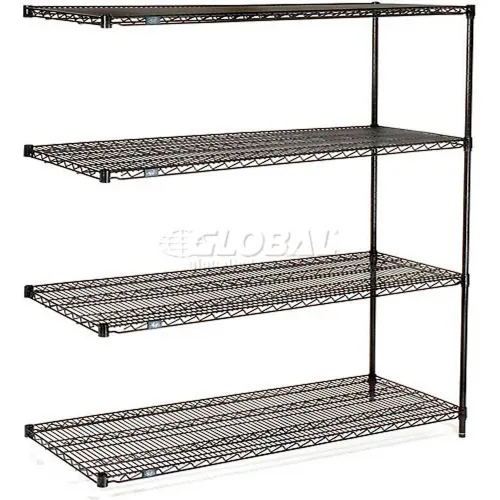 Add-On shelving units allow unit expansion to make the most of storage space. Includes 2 posts with leveling feet, 4 shelves, snap-on sleeves and S-hooks to join units. Black Epoxy is an attractive, rugged and affordable finish. This epoxy wire shelving is NSF approved for wet or dry use. , Lot of 1