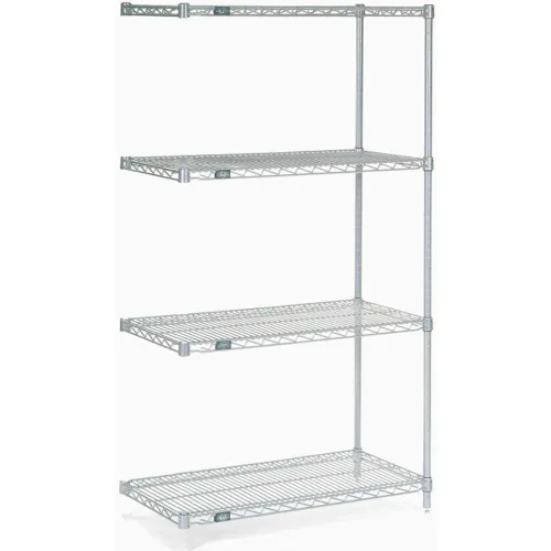 5 Tier Silver Epoxy Wire Shelving Add-On Unit, 36"W x 24"D x 63"H. Add-On shelving units allow unit expansion to make the most of storage space. Includes 2 posts with leveling feet, 5 shelves, snap-on sleeves and S-hooks to join units. Nexelate™ is an attractive finish that consists of a Silver Epoxy powder-coat over a rust inhibiting undercoat. NSF approved for wet or dry use. Reinforced shelves with welded surface ribs for added strength. Open design to maximize air and light circulation and minimize dust accumulation. Includes 5 shelves, 2 posts, snap-on sleeves and S-hooks to join units. Shelves easily adjust without tools at 1" increments. NSF approved for wet or dry use. , Lot of 1