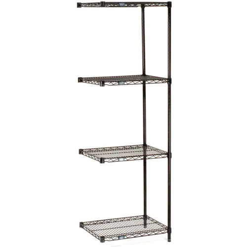 5 Tier Black Epoxy Wire Shelving Add-On Unit, 60"W x 24"D x 63"H. Add-On shelving units allow unit expansion to make the most of storage space. Includes 2 posts with leveling feet, 5 shelves, snap-on sleeves and S-hooks to join units. Black Epoxy is an attractive, rugged and affordable finish. This epoxy wire shelving is NSF approved for wet or dry use. Reinforced shelves with welded surface ribs for added strength. Open design to maximize air and light circulation and minimize dust accumulation. Includes 5 shelves, 2 posts, snap-on sleeves and S-hooks to join units. Shelves easily adjust without tools at 1" increments. NSF approved for wet or dry use. , Lot of 1