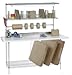 In Stock Inexpensive Packaging Work Sataions Consider ordering a fully applianced unit as shown Bench Top is 34 inches High With 8 smaller top shelf dividers roll holder - over head light - 3 carton dividers and even the back ledge and document holder Or order a 'basic plus' unit with or without accessories The basic plus includes the bench top - legs - lower and upper shelves Lower shelf is 24 inches deep bench Top is a fine Plastic Laminate Of course we stock the Deluxe Turnkey Packing Station Also Order Now!