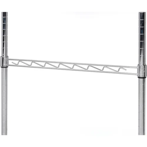 Chrome Hanging Rail 24". Hanger Rails can be mounted along the length or width of shelving unit. Hooks can be easily attached to Hanger Rails. Fits all Nexel® Posts For Wire Shelving. Chrome over nickel electro plating creates a brilliant high gloss finish. Easy assembly. NSF approved dry use. , Lot of 1