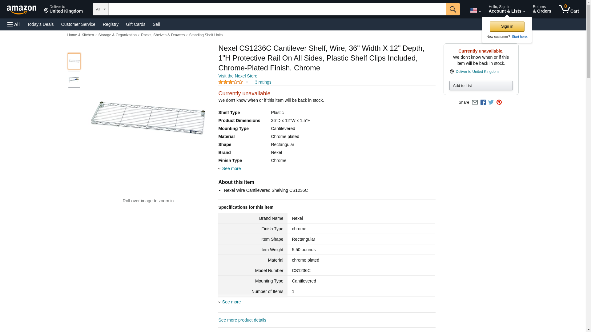 Nexel CS1236C Cantilever Shelf, Wire, 36" Width X 12" Depth, 1"H Protective Rail On All Sides, Plastic Shelf Clips Included, Chrome-Plated Finish, Chrome