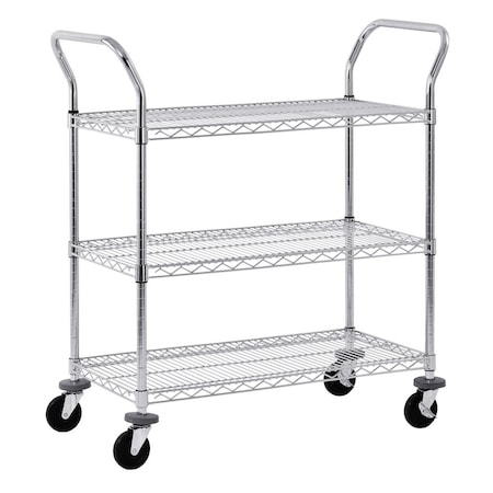 Deliver your curbside order more efficiently. Provides high visibility and easy 4-way access. Allows you to keep one order, or multiple orders ready to transport. Cart consists of 4 posts, 3 shelves, plastic shelf clips, chrome document holder, chrome basket, push handle, donut bumpers, tie bar, and pneumatic casters, two swivel, two rigid. Chrome glove holder and other accessories sold separately. Posts are 34"H. Trucks feature 5" polyurethane stem casters with a 1200 lb load capacity and 43" overall height., Lot of 1